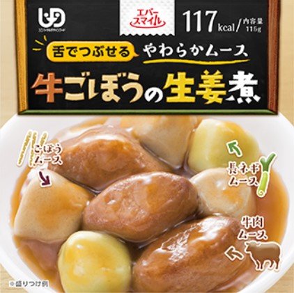 Allergen : Egg,Milk,Wheat,Soybean Product name (JAP) : 牛ごぼうの生姜煮 Product name (CHI) : 牛肉牛蒡生姜煮慕斯 牛肉在柔軟的慕斯中完成,牛蒡配長洋蔥慕斯,姜味和醇厚。 這是一種新的慕斯食品,您可以享受外觀的顏色和每種材料的味道。您可以將調味液和慕斯混合在一起,將其壓碎,從而根據自己的喜好改變柔軟度。慕斯足夠柔軟,可以用舌頭壓碎(基於通用設計罩)。